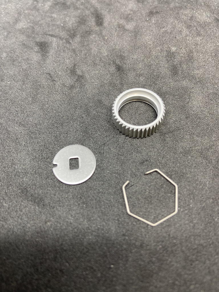 3.アベイル製音出しラチェットに用意したスプール受けをつけて、ラチェットバネを組み込む(ラチェットバネの端をスプール受けの溝に入れるようにして組み込んでください)