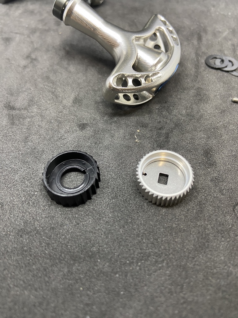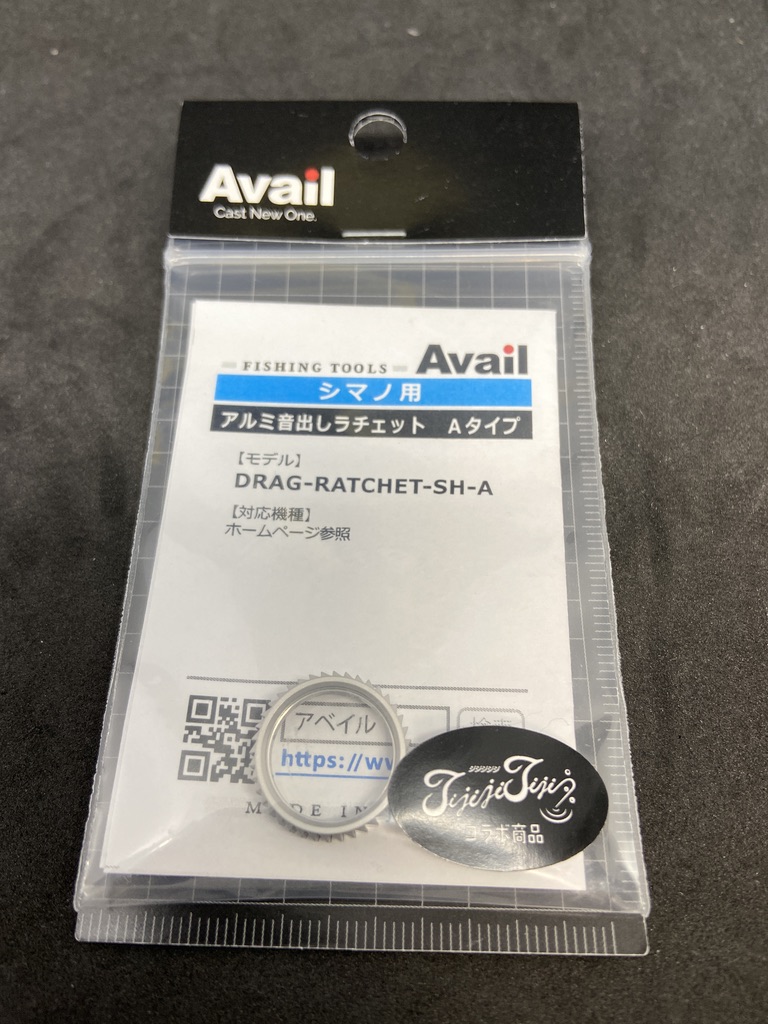 今回の「アルミ音出しラチェット Aタイプ」は、シマノリール専用のドラグ音を追加するためのパーツ。純正では樹脂製24山のところ、アベイル製のものはアルミ製40山になっているので、かなり細かいピッチで鳴らせるようになり、音質も樹脂からアルミになり、更に高級感が増します。